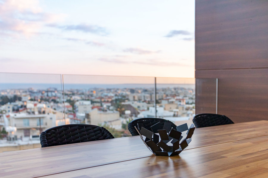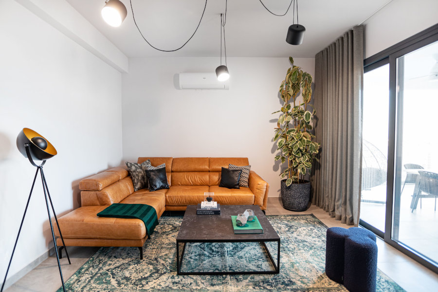 Located in an upcoming neighborhood of Limassol, this two-bedroom flat offers unobstructed views of the city’s skyline and the Mediterranean Sea. Inspired by the lofts in Soho and Brooklyn in New York, this flat’s interior can be easily described as sophisticated yet industrial, with luxurious finishes and materials.