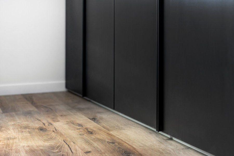 In this project we used more warm and inviting finishes such as the wood flooring, the brick wall and the wood cabinets in the kitchen area, which are integrated smoothly with more solid materials like the natural black granite kitchen tops, the solid dark grey wood and the brown leather sofa. Our aim was to produce an open plan fully functional space which meets the client’s needs, but still expressing the initial architectural and interior line of the project.